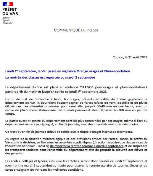 En raison des conditions météorologiques et selon les directives du préfet, pour des raisons de sécurité, la rentrée de TOUS LES ELEVES dans le département du Var est décalée au mardi 2 septembre, selon les mêmes horaires que ceux qui ont été communiqués pour le 1er septembre.